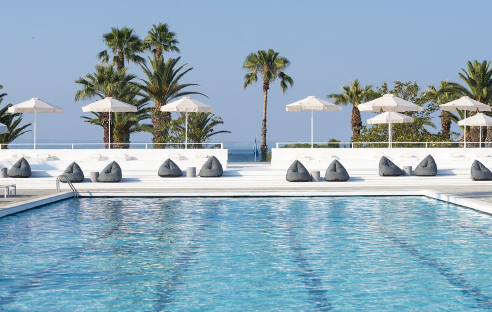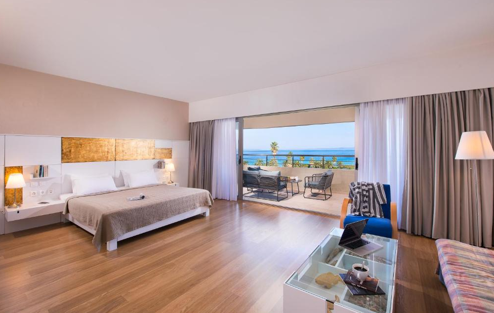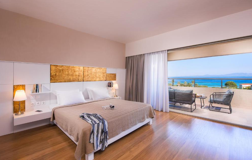 Grande Suite Sea view- 60 m2, idealno locirani na najvišem spratu glavne zgrade, nudeći veličanstven pogled na Egejsko more sa svojih privatnih balkona, prostrano kupatilo sa đakuzijem, odvojenu tuš kabinu i spavaći deo sa bračnim krevetom.