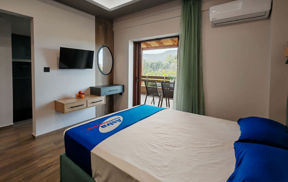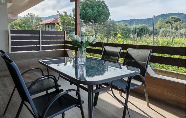 Nalazi se na oko 390m od mora, sa uređenim dvorištem sa roštiljem, parkingom i manjim dečijim igralištem. Studiji za 2 do 4 osobe su smešteni u prizemlju i na prvom spratu.Kuća ima SAT TV, signal za besplatan bežični internet i klima uređaje čije je korišćenje uključeno u cenu. Gostima je na raspolaganju dvorište sa bazenom i roštiljem u kući Katerina Resort koja je udaljena nepunih 50m. Uz minimalnu doplatu je omogućeno korišćenje i veš mašine.