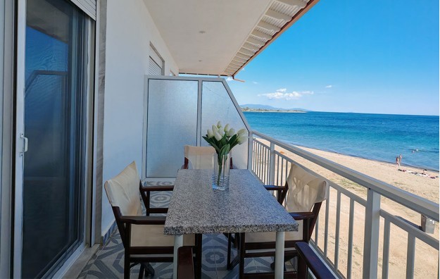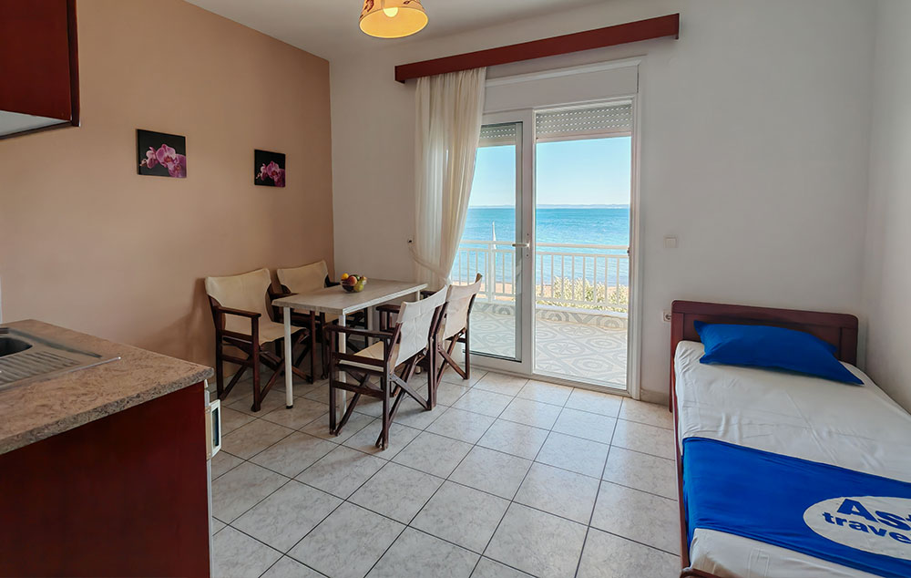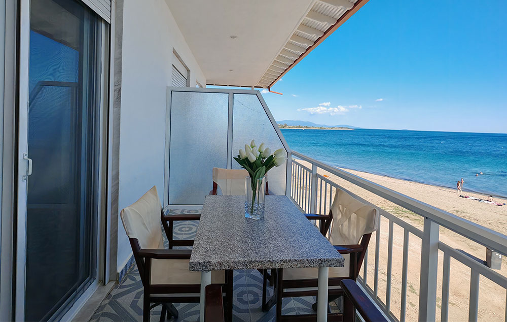 Kuća Alexandra nalazi se na samoj plaži mesta Psakoudia i odlikuje se terasama koje imaju direktan pogled na more. Četvorokrevetni studiji i apartmani nalaze se na prvom i drugom spratu. Kuća ima signal za bežični internet, a smeštajne jedinice imaju TV i klima uređaj čije je korišćenje uključeno u cenu u julu i avgustu.