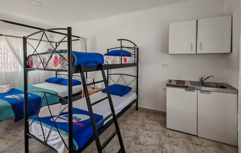 Svi studiji i apartmani imaju terasu, wc i tuš sa toplom i hladnom vodom, sto i stolice, orman, čajnu kuhinju sa frižiderom koja je opremljena prema broju osoba (tanjiri, čaše, šolje, escajg, šerpa, tiganj, džezva za kafu ). Promena posteljine je na pola smene, za smene duže od 8 noći. U većini objekata domaćini kuća na dan zamene posteljine dostavljaju čistu posteljinu koju gosti sami menjaju kao što i sami održavaju higijenu smeštajne jedinice tokom svog boravka. U pojedinim objektima, osoblje kuće ulazi u smeštajne jedinice i samostalno vrši zamenu posteljine. Pored standardne opreme, smeštajne jedinice mogu imati i određenu opremu koja ih izdvaja u odnosu na ostale smeštajne jedinice iz ponude. U cenovnicima se pored naziva određenih kuća nalaze brojevi.