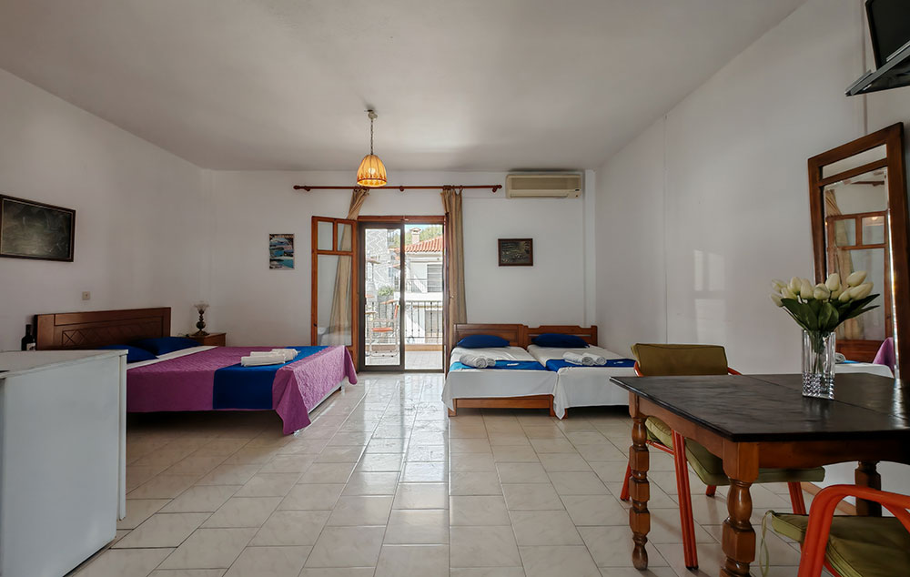 Kuća Artemis se nalazi na 150m od gradske plaže u Neos Marmarasu. U ponudi su trokrevetni i četvorokrevetni studio na prvom spratu sa izuzetno prostranim terasama sa direktnim pogledom na more. Svi imaju kuhinju, dve terase, jednu okrenutu ka moru, televizor, klima čije je korišćenje uključeno u cenu u julu i avgustu kao i signal za besplatno korišćenje bežičnog interneta. Od 01.05. pored studija sa pogledom na more u ponudi su i studiji bez pogleda na more u koje se ulazi tako što se spušta u nisko prizemlje, ali terase nisu ispod nivoa ulice već su okrenute ka moru i izdignute su na nivo visokog prizemlja.