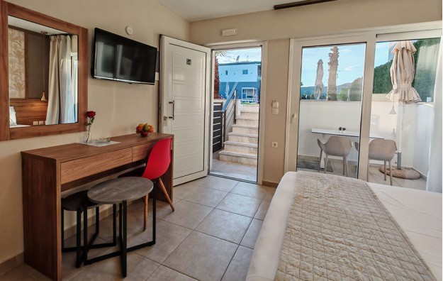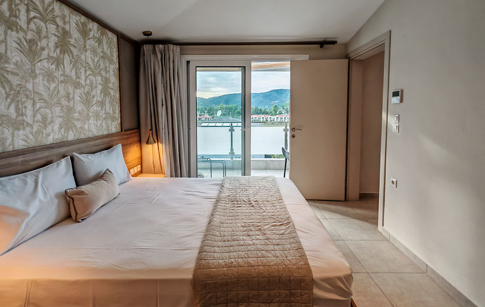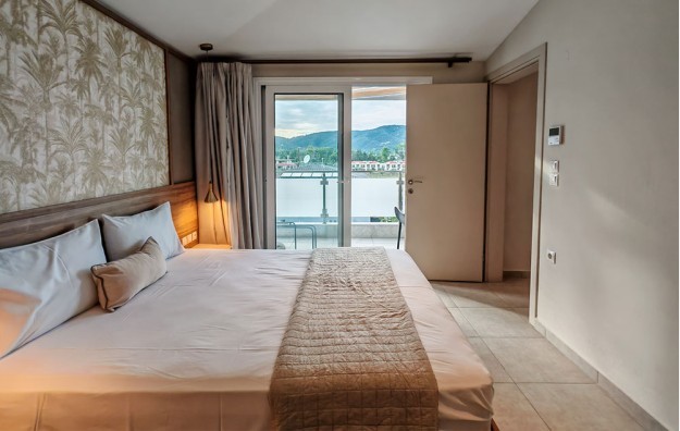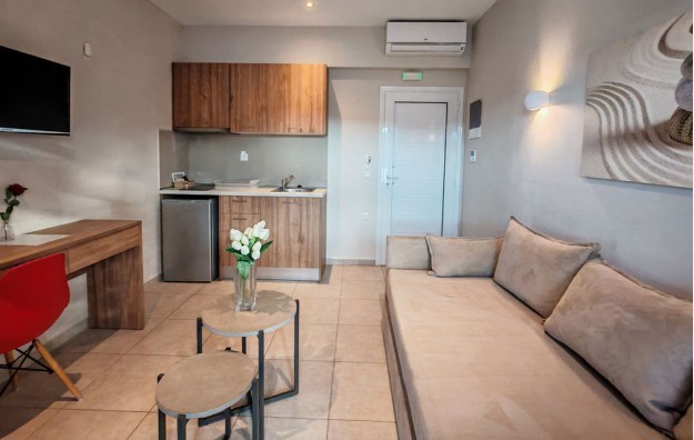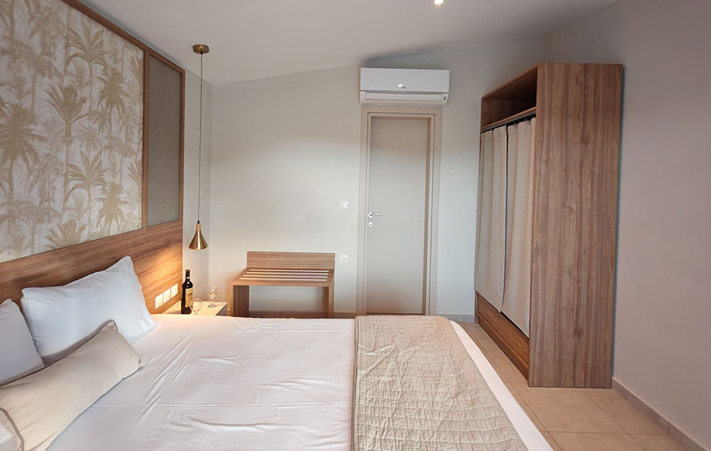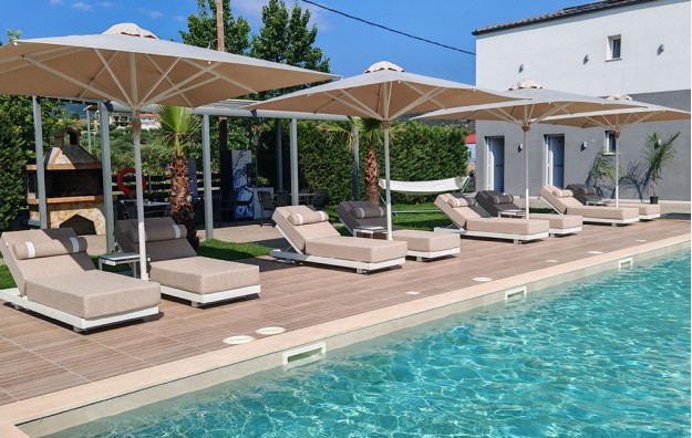 Nova luksuzna kuća nalazi se na oko 290m od najlepšeg dela peščane plaže u Sarti Beach-u. Veoma prostran kompleks gostima nudi veliko travnato dvorište sa bazenom od preko 70m2, dečijim bazenom od 12m2, roštilj i parking. U ponudi su studiji i apartmani u niskom prizemlju, na prvom, drugom i trećem spratu. Kuća ima SAT TV, klima uređaje čije je korišćenje uključeno u cenu kao i signal za besplatan internet. Organizovano je čišćenje studija i apartmana nekoliko puta tokom smene. Smeštaj u svakom smislu podseća na boutique hotele i opravdano je najskuplji i najtraženiji u Sartiju.