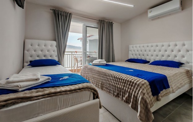 Petokrevetni superior apartman sa direktnim pogledom na more nalazi se na drugom spratu u kući F&M. Izdvaja se po opremljenosti kuhinje koja ima šporet sa 4 ringle i rernom kao i mašinu za pranje sudova i visokim frižiderom i zamrzivačem. Izdvaja se po opremljenosti kupatila sa tuš kabinom i mašinom za veš. U dnevnoj sobi se nalazi dvosed koji se pretvara u krevet na rasklapanje (širine 120 cm). U spavaćoj sobi se nalazi king size francuski krevet (širine 180 cm) i klasičan ležaj za jednu osobu. I dnevna soba i spavaća imaju svoju terasu. Pored svega navedenog izdvaja se po veoma izdašnom garderobnom prostoru gde se bez problema može raspakovati petočlana porodica jer za razliku od ostalih smeštaja ima američki plakar sa tri klizna dela kao i još jedan dvokrilni orman. Svaka soba ima TV i klima uređaj nove tehnologije Midea Breezless koji se može podesiti da klima radi bez stvaranja neprijatnog hladnog vazduha.