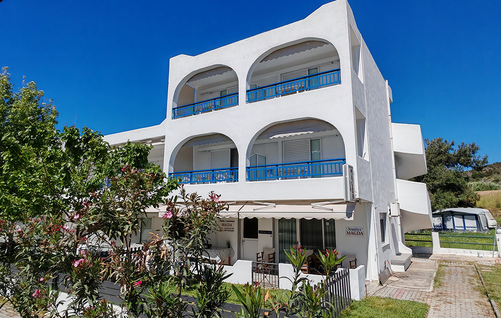 Nalazi se na oko 80m od plaže u najlepšem delu Kalamicija. Apartmani i studiji se nalaze u prizemlju, na prvom i drugom spratu. Kuća ima SAT TV, signal za bežični internet i klima uređaje čije je korišćenje uključeno u cenu. Kuća ima i uređeno travnato dvorište sa zajedničkim roštiljem, kao i nekoliko parking mesta za goste kuće.
