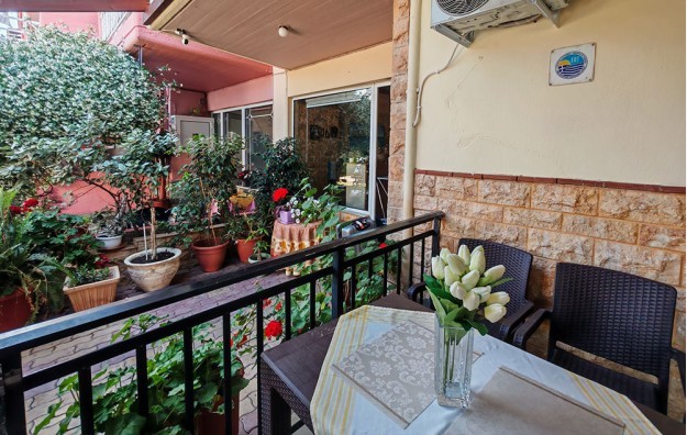 Nalazi se u starom delu Sartija, na oko 180m od mora, a na samo 40m od trga. Apartmani se nalaze na prvom i drugom spratu i imaju prelepe terase sa pogledom ka uređenom dvorištu ispred kuće. Kuća ima SAT TV i signal za besplatno korišćenje bežičnog interneta, kao i klima uređaje čije se korišćenje doplaćuje. Na pola smene je organizovano čišćenje i zamena posteljine i peškira. Deo smeštajnih jedinica je renoviran 2025. godine i jasno je izdvojen u cenovniku kao new.