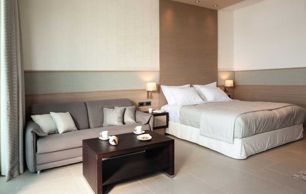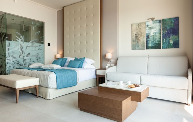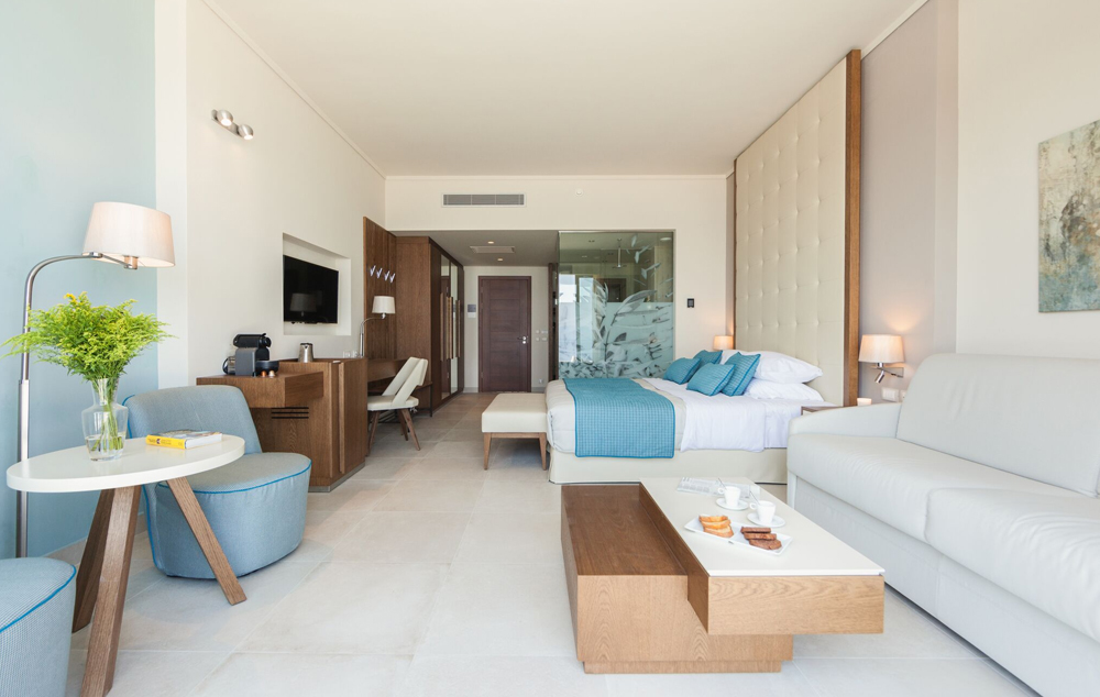Deluxe Pool Front Room-Oko 37-39 m2, opremljen sa dva odvojena kreveta ili bračnim krevetima, sofom/krevetom i tušem ili kadom. Pogodna veranda sa privatnim vrtom, sa prekrasnim pogledom na more/bazen. Može da primi do 4 osobe.