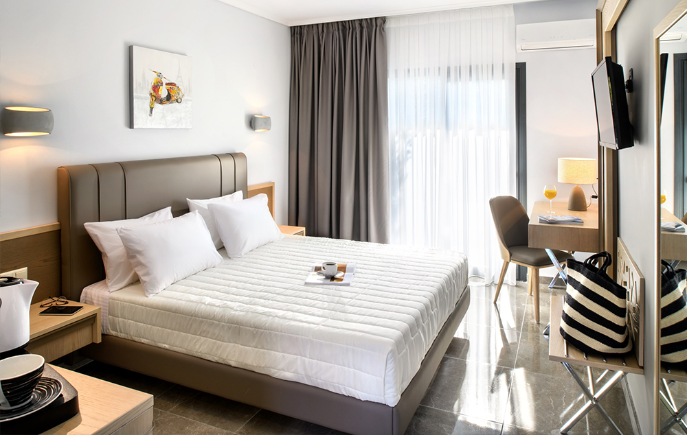 Suite Garden View-35 m2, ima dvokrevetnu spavaću sobu i odvojeni dnevni boravak sa kaučem na razvlačenje za 2 osobe,pogled na baštu.