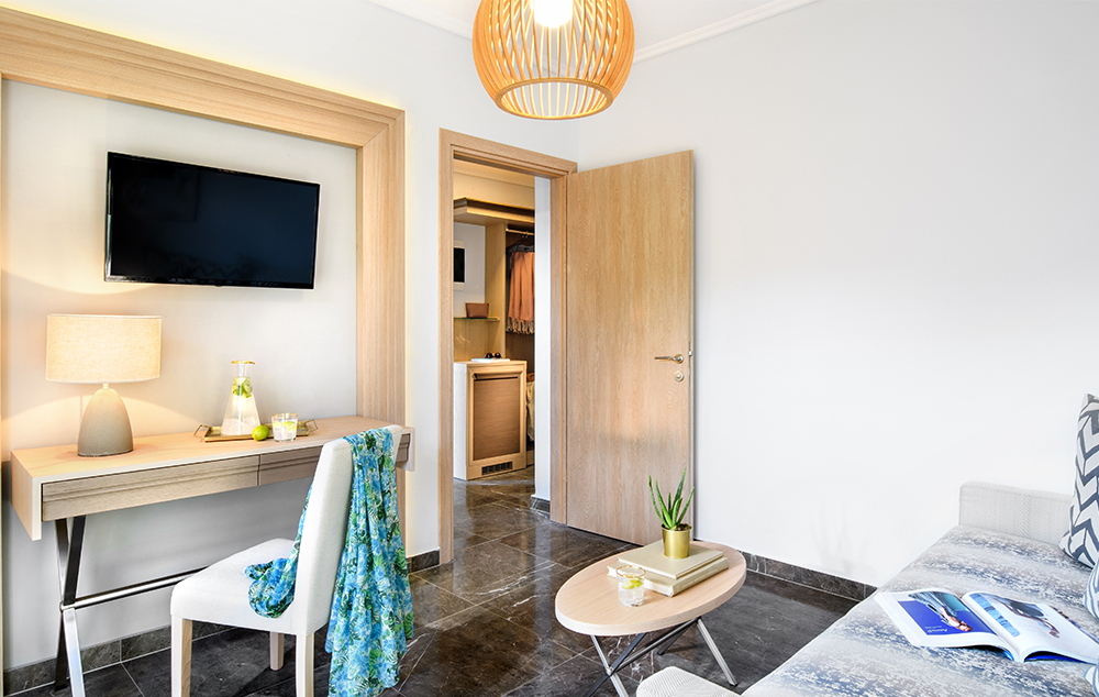 Suite Pool View-35 m2, ima dvokrevetnu spavaću sobu i odvojeni dnevni boravak sa kaučem na razvlačenje za 2 osobe,pogled na bezen.
