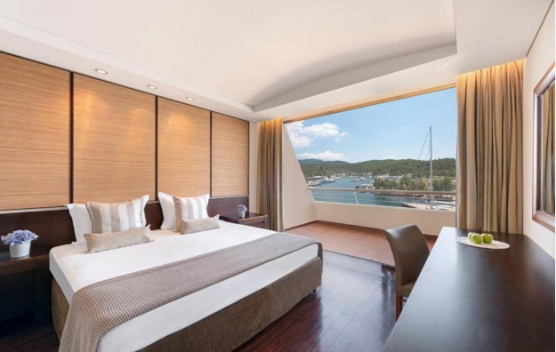 Junior Suite Sea or Marina View-40-42 m2, prostrana kombinovana dnevna soba-spavaća soba, uređena u savremenom stilu, sa bračnim krevetom i pomoćnim ležajem, sa pogledom na marinu ili more sa strane.