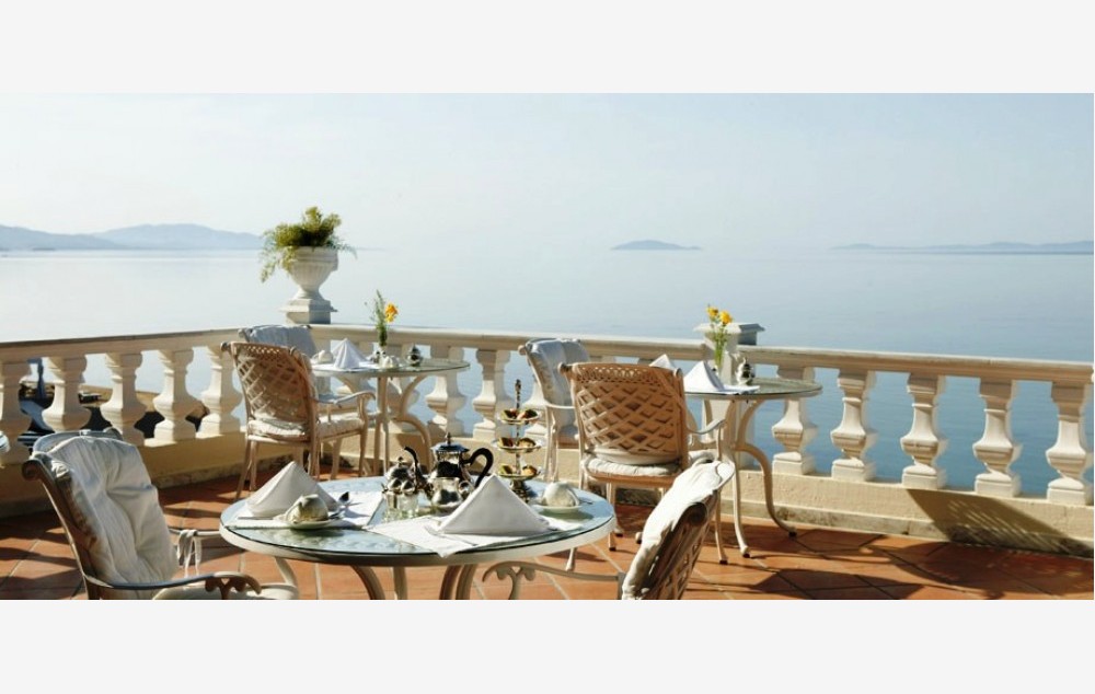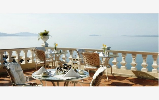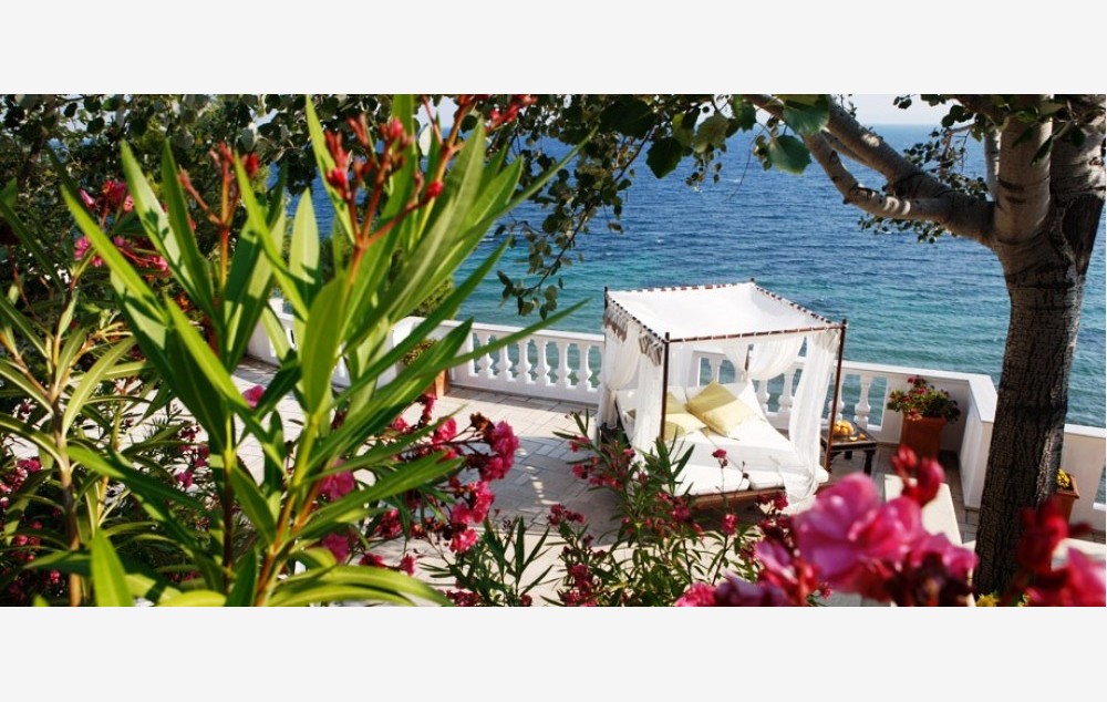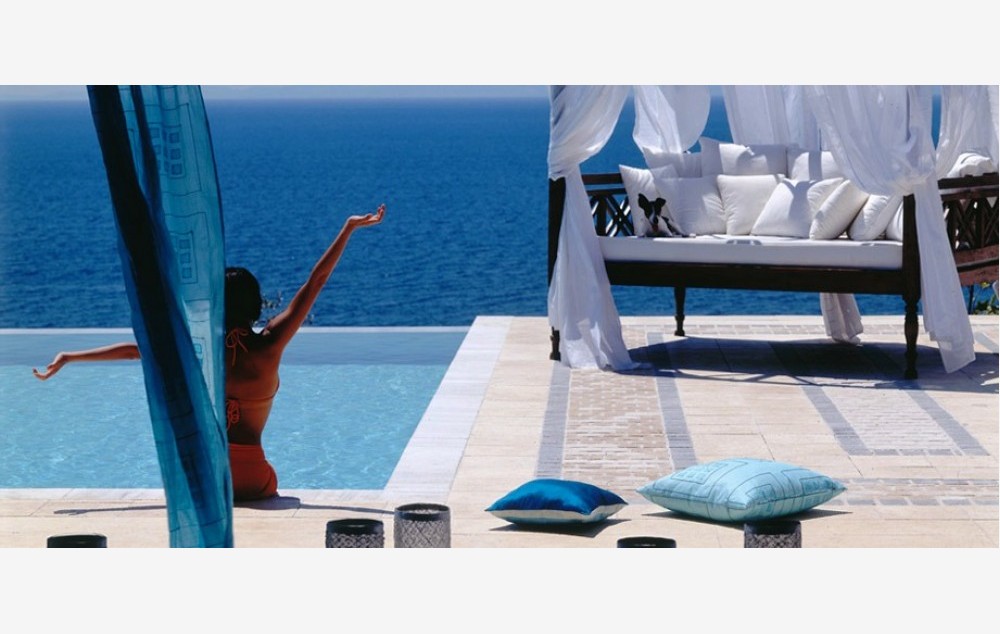 Villa of the Blue Riviera-Ova osamljena vila od 450 kvadratnih metara smeštena na 700 kvadratnih metara rascvetanog cveća, rascvetalog drveća limuna, borova i narandže ima četiri spavaće sobe, tri kupatila, bezgranični mermerom obložen životni prostor i otvoreni raj sa dvorištem, bazenom i letnjim đakuzijem na otvorenom. Ova vila koja se nalazi na lokaciji na vrhu brda nudi nesumnjivo jedinstven suveren pogled na Egejsko more iz izuzetno prestižnog paviljona u Olimpovom stilu i prostor za sedenje sa otvorenom kuhinjom koji se impresivno nadvija nad bujnom baštom. Stil ovog imanja u svetloj vodenoj paleti, sa ručno rađenim staklom i najfinijim poliranim mermernim podovima, umetničkim raznovrsnim dekoracijama plafona i gracioznim nameštajem pruža neuporedivo vrhunski ambijent i odraz veličanstvene mitološke rezidencije drevnih bogova.