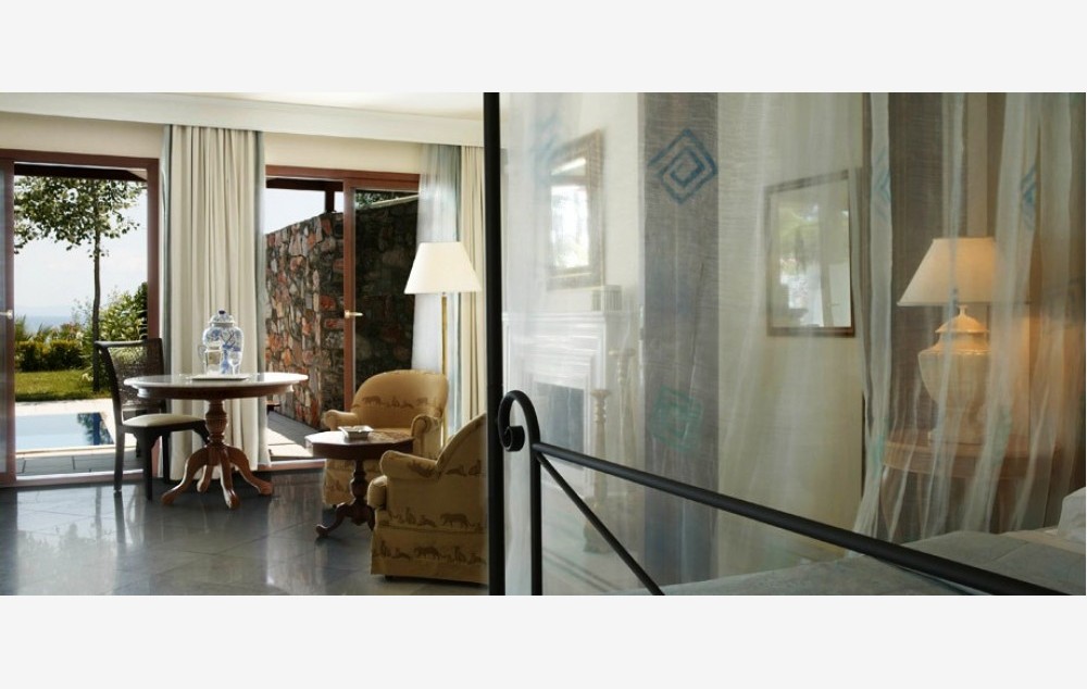 Pool Suite With Small Garden and Sea View-50-60 m2, Pool Suite sa malom privatnom baštom uključujući otvoreni grejani bazen. Zid od staklenih vrata otvara se na privatnu terasu sa bazenom sa pogledom na Sredozemno more kojem se ne može a da se ne divi iz osvežavajućeg ili ugodno zagrejanog bazena, kao i iz lepo uređene spavaće sobe i dnevnog boravka. Privatna terasa i bašta ovog Doma za dvoje pozivaju na radost jutarnjeg kupanja u bazenu i privatnog opuštanja sa prstima u travi u kombinaciji sa elegantnim i velikodušnim ambijentom kada se nađe unutra.