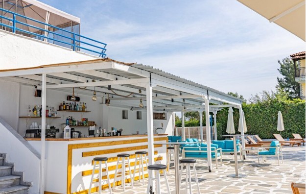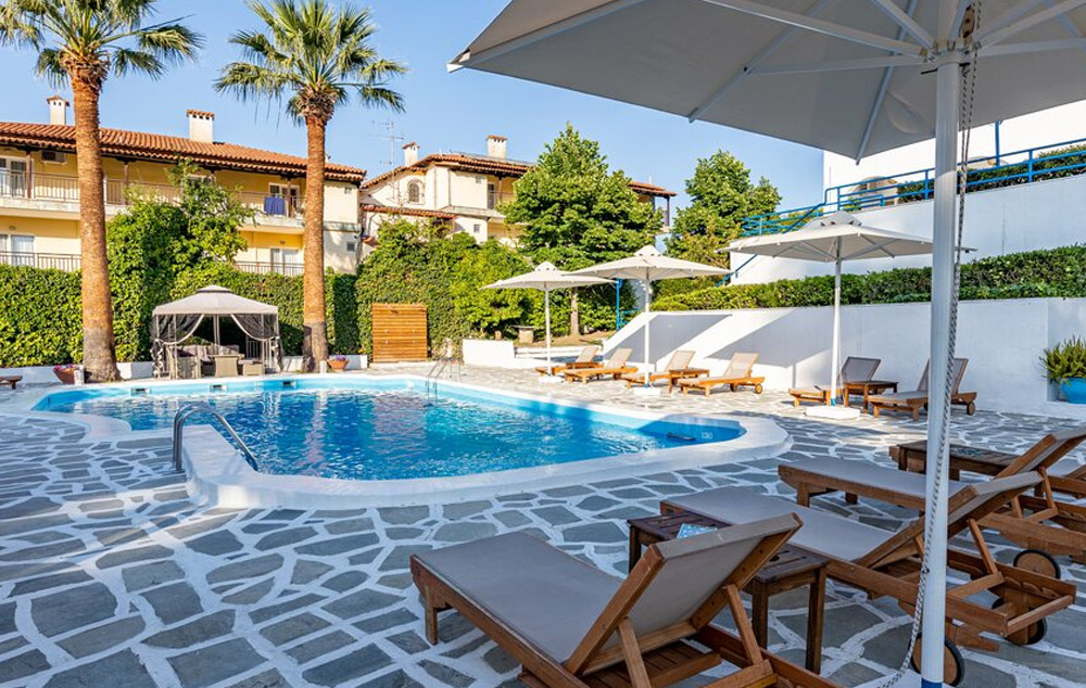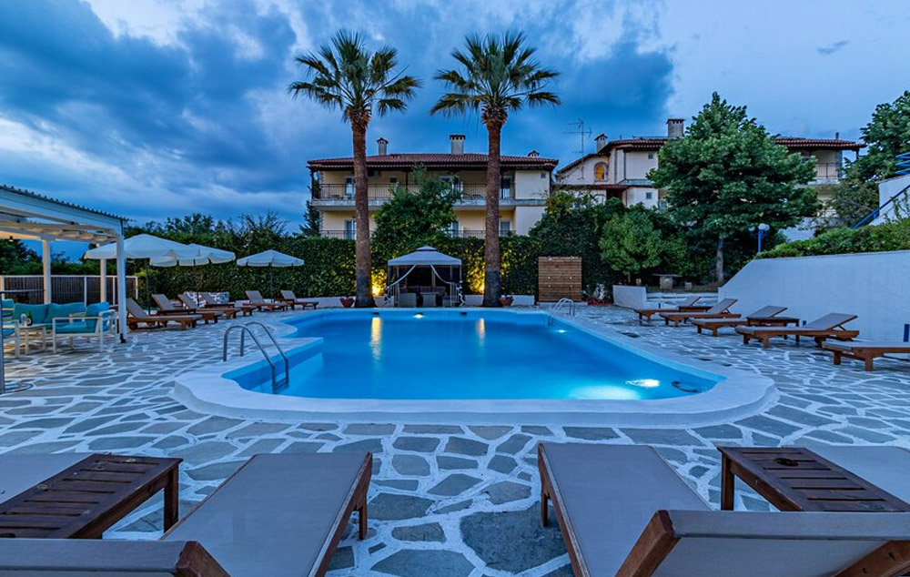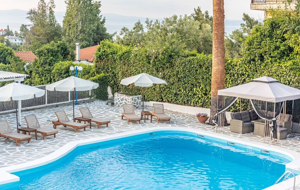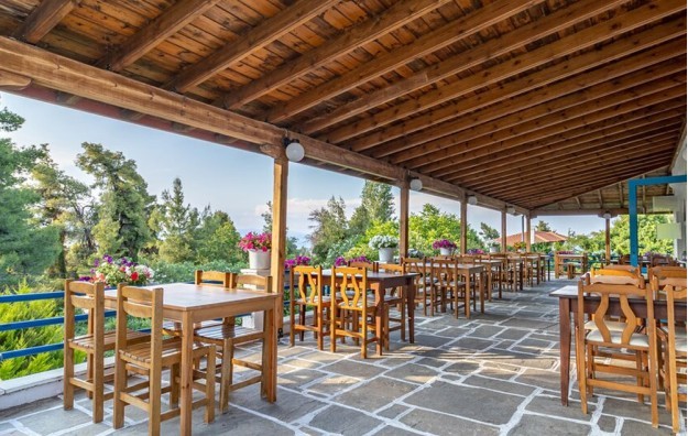 LOKACIJA: Smešten je na oko 600 metara udaljenosti od uredjene peščane plaže, u potpunosti zaklonjen gustom borovom šumom po kojoj je Kriopigi poznat.