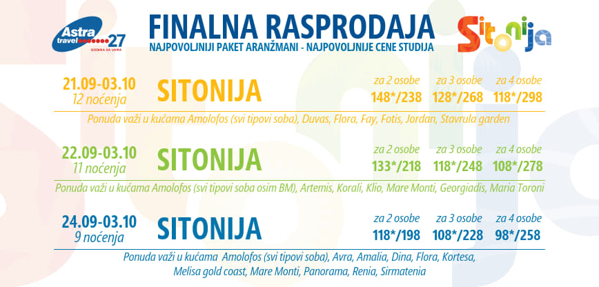 - Cena paket aranžmana je cena po osobi koja uključuje izabrani smeštaj i prevoz iz Beograda do Sitonije. Postoji mogućnost doplate transfera za polazak iz ostalih mesta.